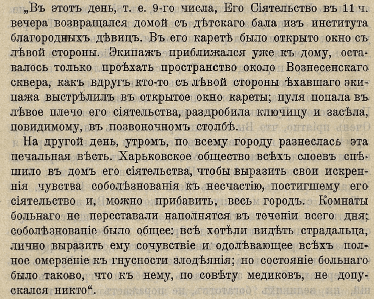 Вечером 9-го февраля 1879-го года, когда губернатор возвращался домой после театра, к его карете подскочил молодой человек, запрыгнул на подножку и выстрелил в окно кареты. Пуля попала губернатору в плечо, раздробила ключицу и застряла в позвоночнике. Нападавший мгновенно исчез в темноте. Губернатора доставили домой, где ему оказали первую медицинскую помощь. Однако рана оказалась смертельной – пуля повредила жизненно важные органы. Через шесть дней, 15-го февраля 1879-го года, Дмитрий Кропоткин скончался.